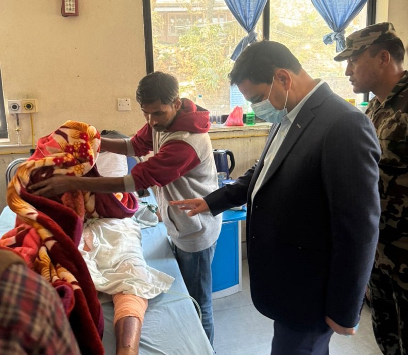 काठमाडौं २८ कमलपोखरीस्थित एक मःमः आउटलेट आगलागीका क्रममा जलेर घाइते बिरामीहरुको उपचार अवस्थाबारे जानकारी लिंदै मन्त्री पौडेलले बिरामीहरुका गुनासा सुने ।